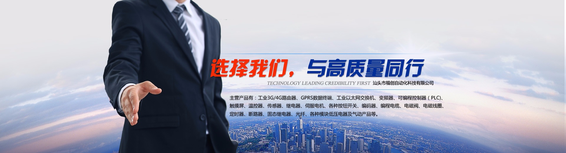 汕頭市福創自動化科技有限公司是一家集自動化元件的代理銷售與維修、自動化設備設計制造、自動化工程安裝改造、機電工程安裝改造、自動化機械設備設計與制造的企業。 主營產品有:工業3G/4G路由器、GPRS數據終端、工業以太網交換機、變頻器、可編程控制器(PLC)、觸摸屏、溫控器、傳感器、繼電器、伺服電機、各種按鈕開關、編碼器、編程電纜、電磁閥、電磁線圈、定時器、斷路器、固態繼電器、光纖、各種模塊低壓電器及氣動產品等。